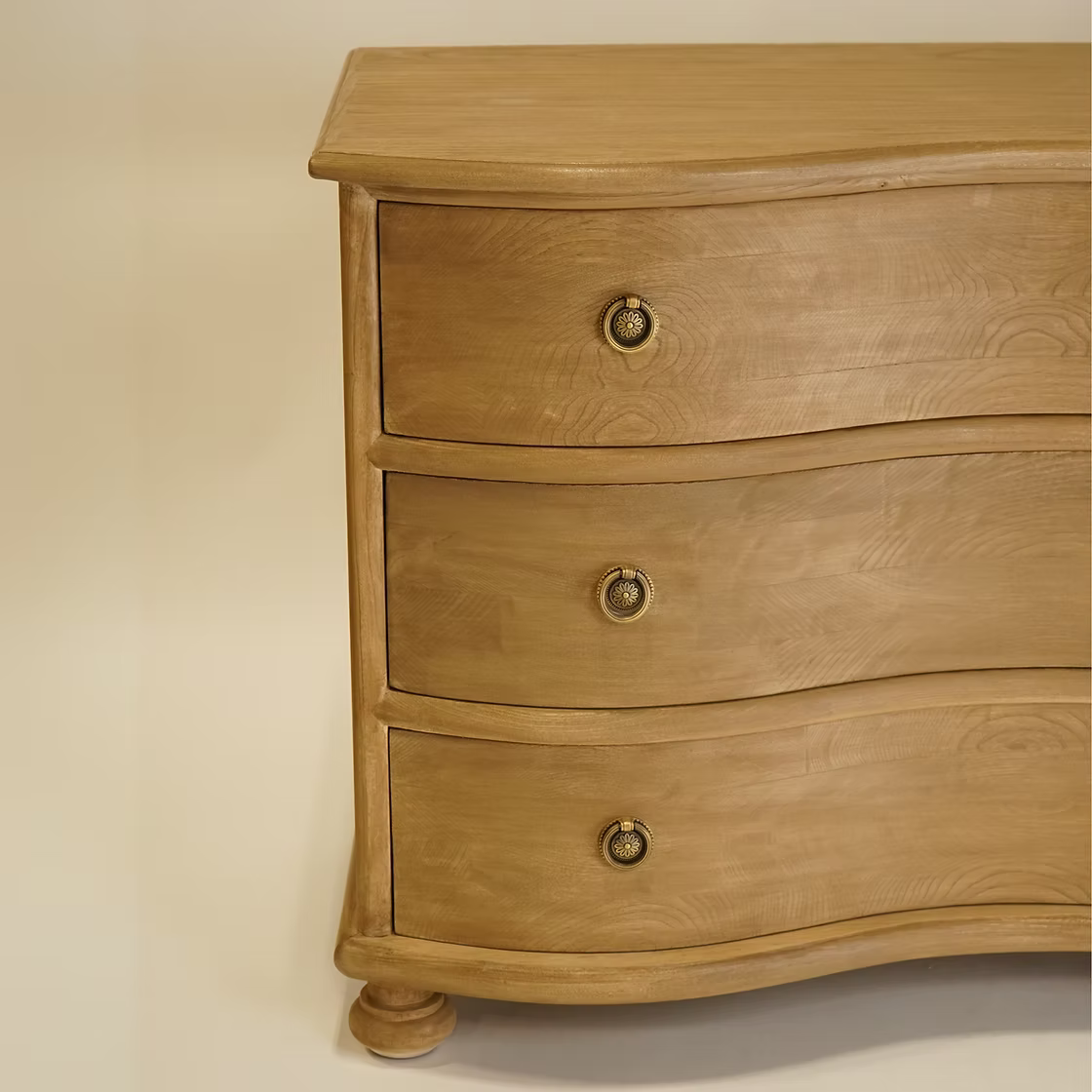 There’s a quiet poetry to the Ashby Chest. Handcrafted from 60–100+ year-old reclaimed wood, its gentle serpentine front and rounded feet bring a softness to solid craftsmanship. The brass pulls feel timeless, while the natural grain of the wood carries the history of its past life — every mark, knot, and subtle shift in tone reminding you this piece has already lived a story before yours.