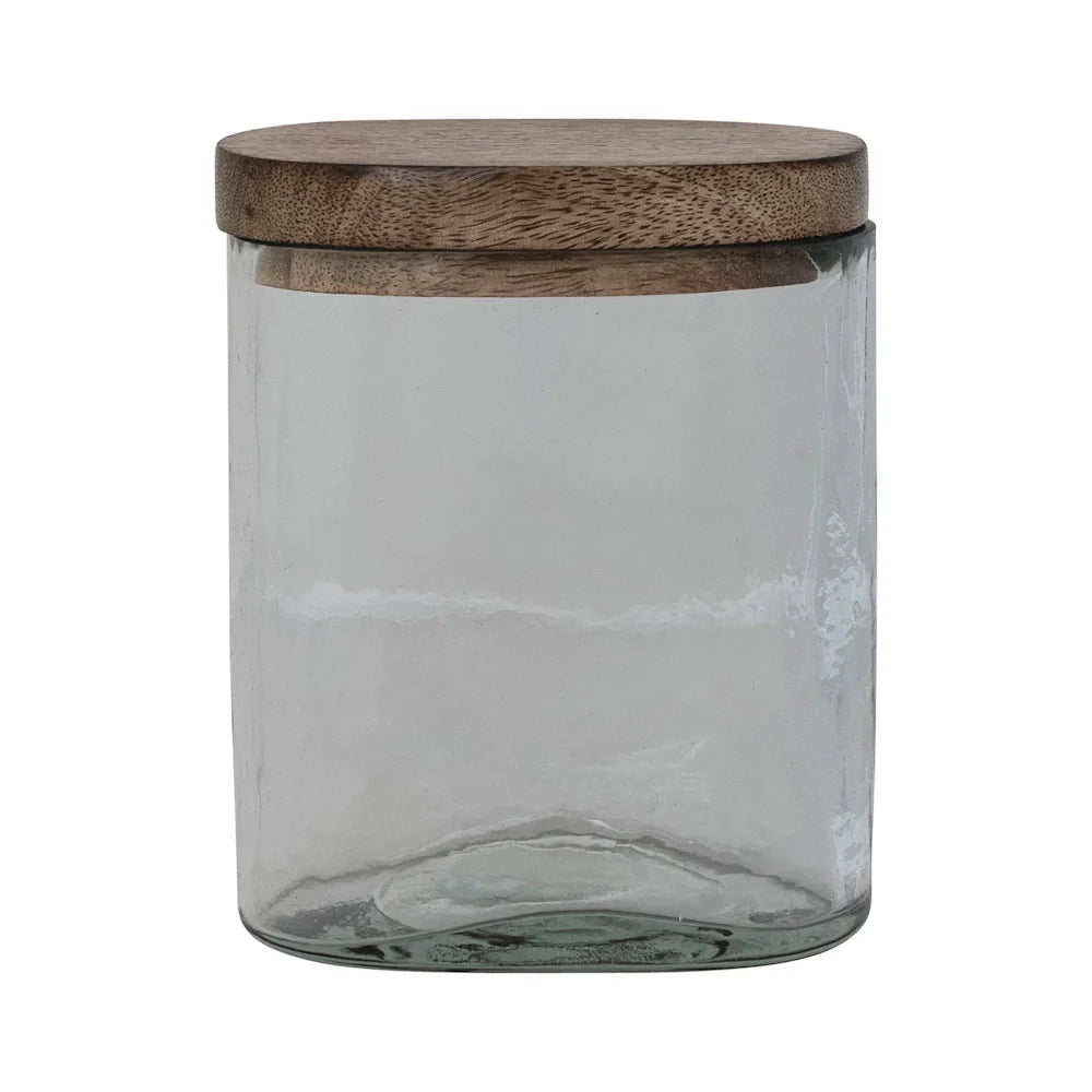 Crafted by skilled artisans, the clear hand-blown glass offers subtle variations that make each jar one of a kind, while the natural mango wood lid adds warmth and organic character.