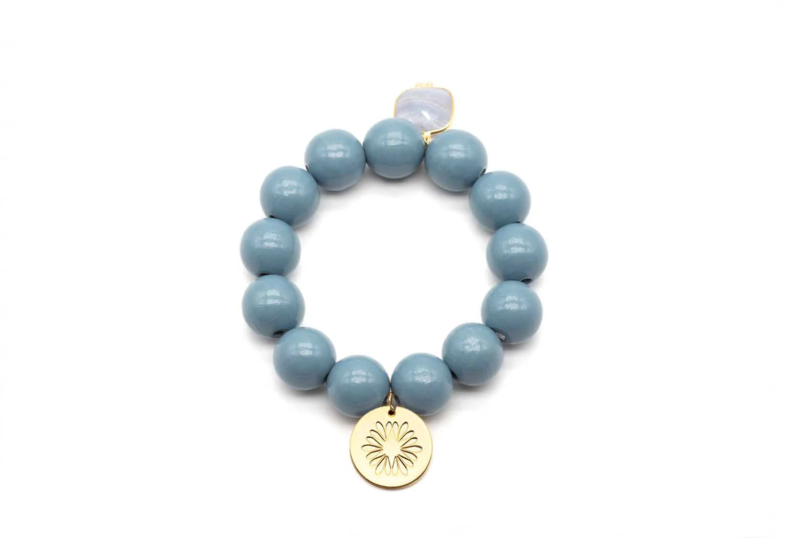 Bracelet on elastic band, gold-plated sterling silver, 16mm grey-blue wooden beads, agate pendant and logo tag in gold-plated brass.