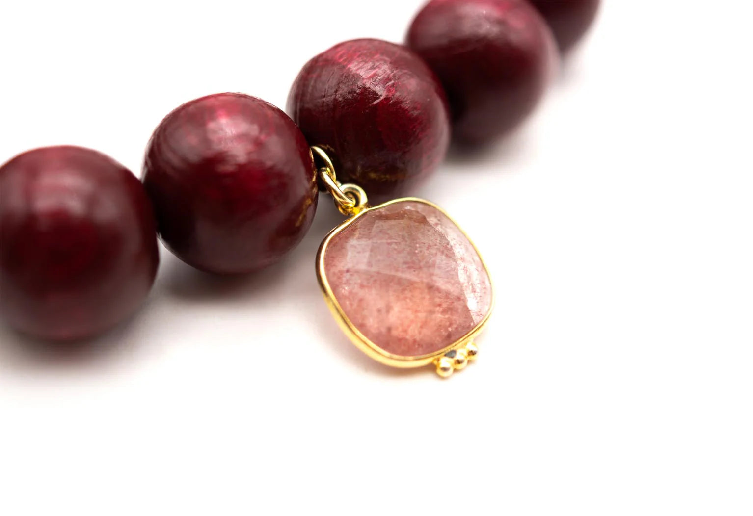 Bracelet on elastic band, gold-plated sterling silver, 16mm wine-red wooden beads, strawberry quartz pendant and gold-plated brass logo tag.