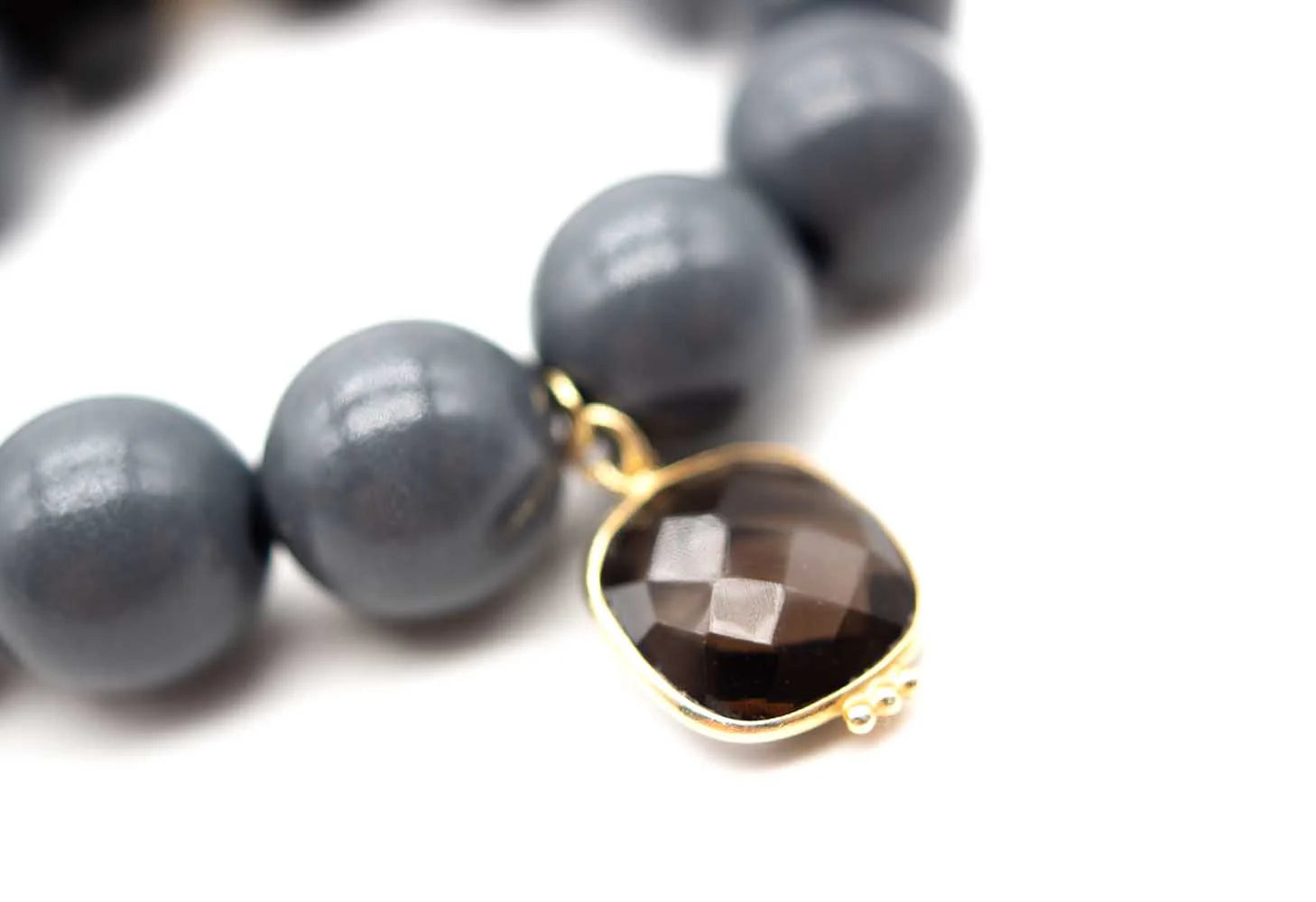 Bracelet on elastic band, sterling silver gold-plated, 16mm dark grey wooden beads, quartz pendant and logo tag in gold-plated brass.