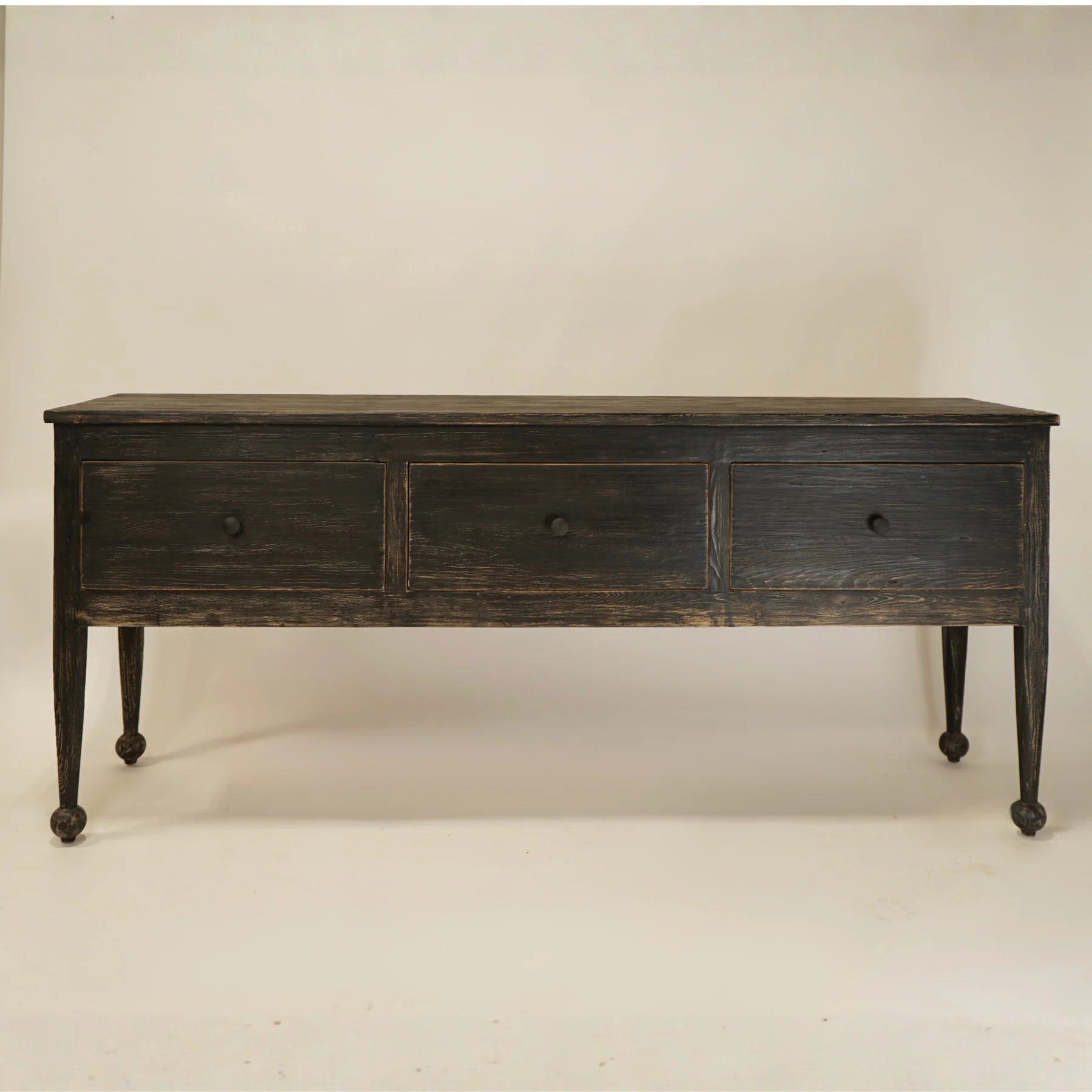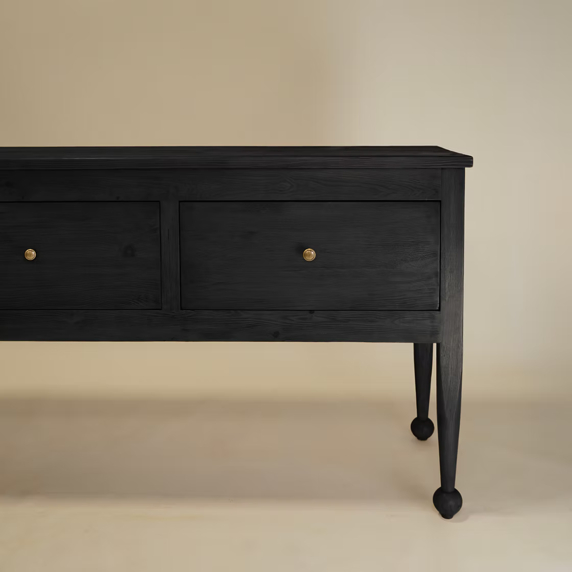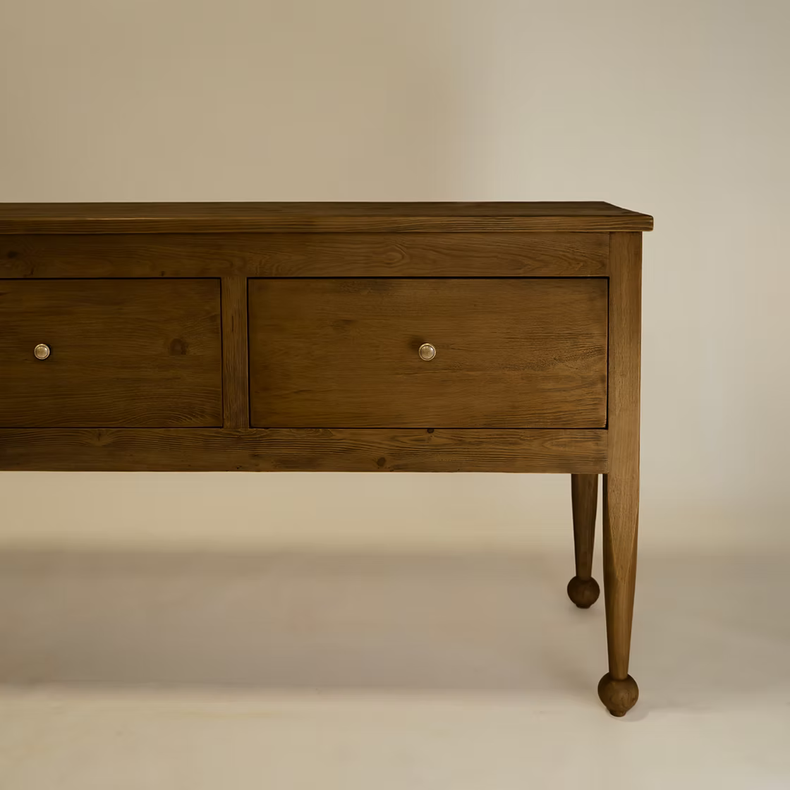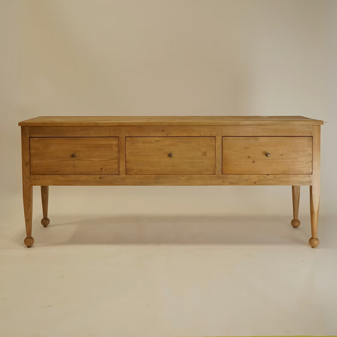 Crafted from reclaimed pine, its natural wood grain and subtle imperfections tell a history all their own, making each piece unique. The three spacious drawers provide functional storage, perfect for tucking away essentials while maintaining a clean and effortless look. Thoughtfully designed with tapered legs and delicately rounded feet, this console blends classic craftsmanship with refined simplicity. Whether styled in an entryway, dining room, or living space, the Margot Console offers both beauty and utility in a way that feels effortlessly collected.