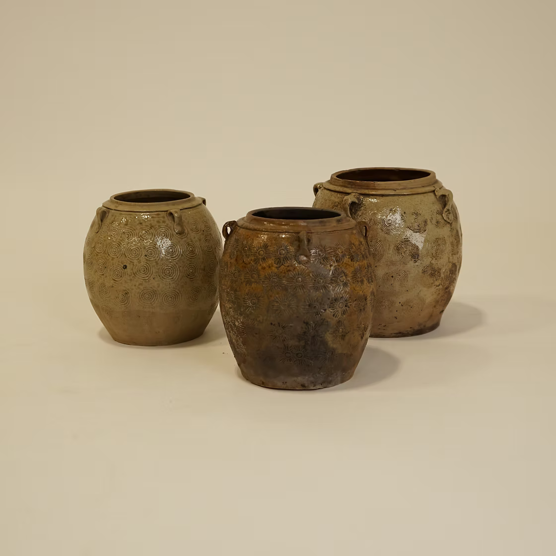 Our Rosie Vintage Pots were once hand-crafted and hand-glazed several decades ago. Their graceful hues of taupe, delicate yellows, and rich browns provide an enchanting backdrop for a intricate patterns on each vessel.
